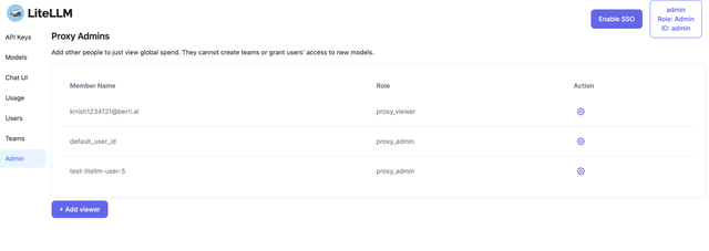 proxy_admin- Admin over the platformproxy_admin_viewer- Can login, view all keys, view all spend (read-only)internal_user- Normal user. Can login, view spend and depending on team-member permissions - view/create/delete their own keys.